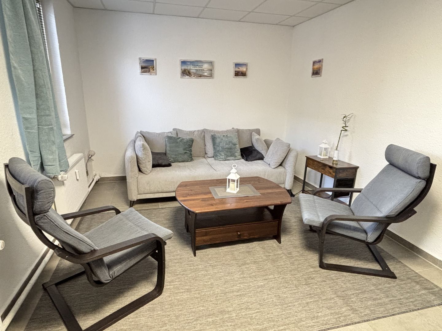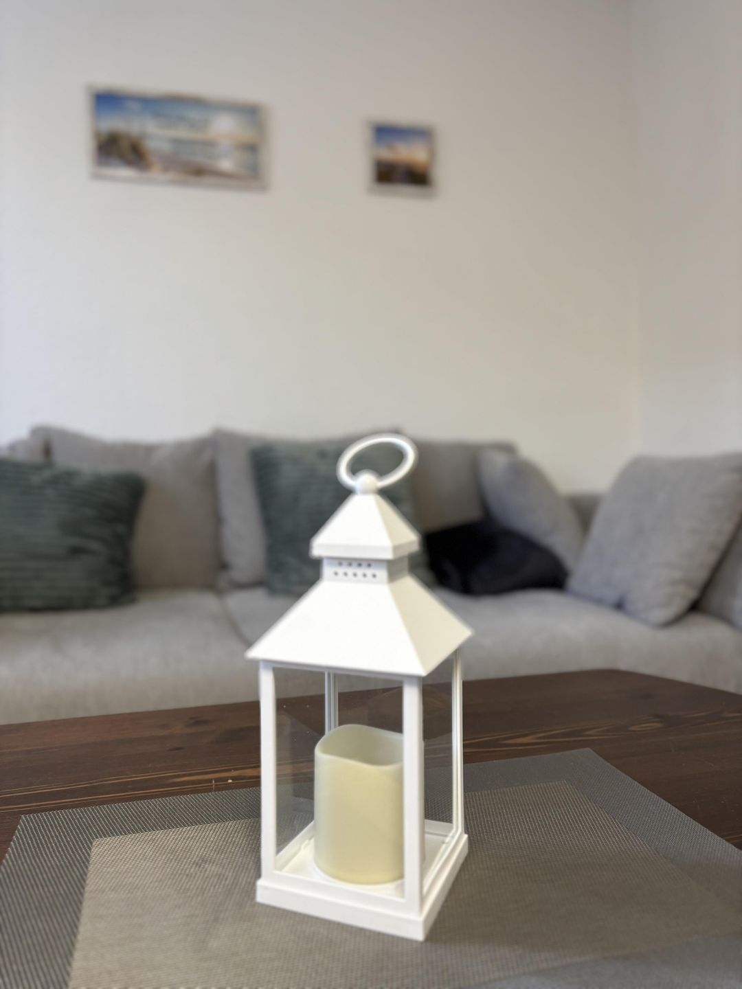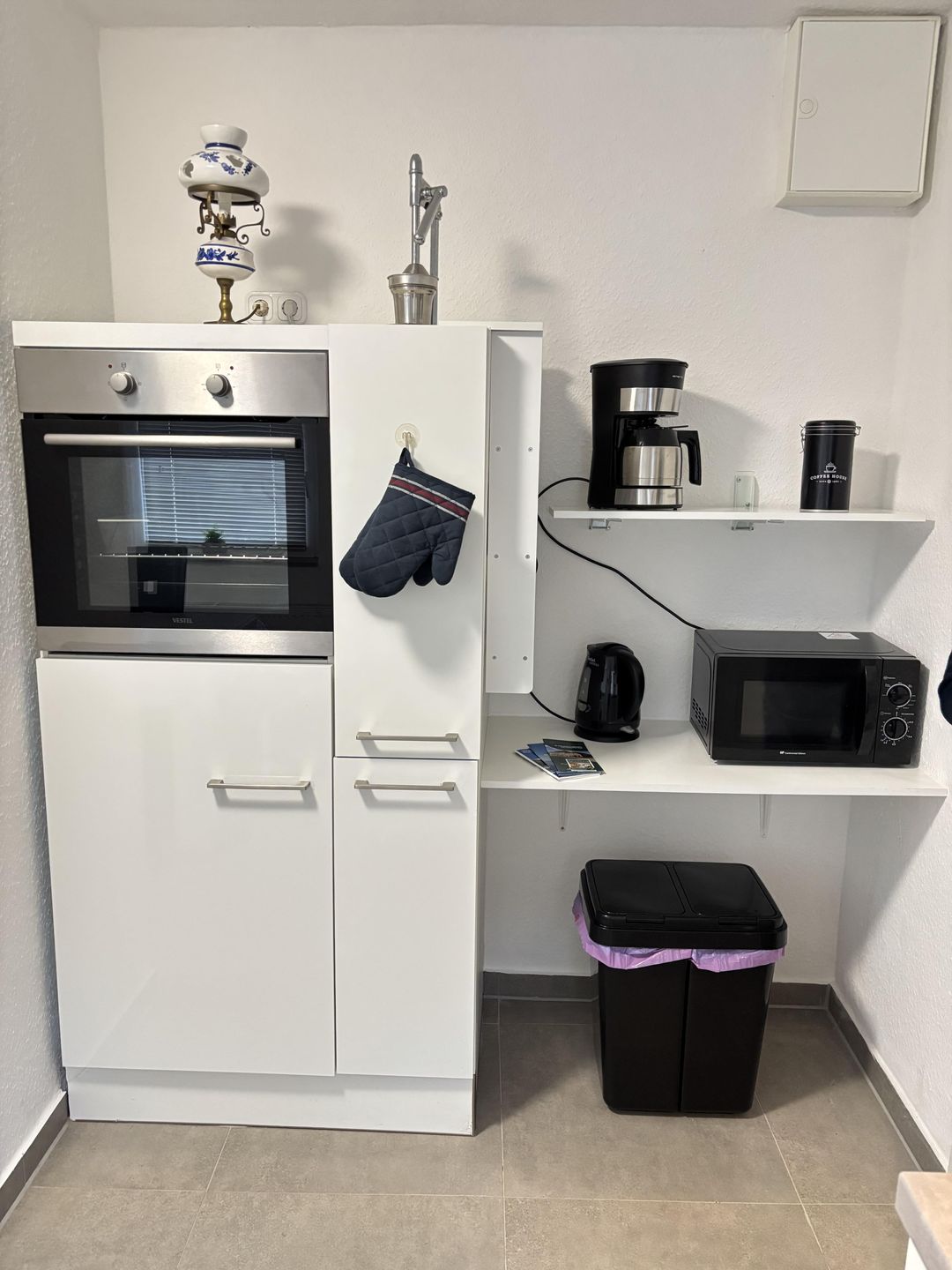 Mit ihren insgesamt fünf Räumen überzeugt die Ferienwohnung durch einen durchdachten Grundriss und eine umfangreiche Ausstattung. Das separate Wohnzimmer mit Sofa, Sessel, Kommode und Fernseher lädt zum Entspannen ein. Der Essbereich, ausgestattet mit Esstisch und Stühlen, befindet sich in der abgeschlossenen Küche, die sämtliche Annehmlichkeiten für die Selbstversorgung bietet: Ein 4-Platten-Elektroherd, Backofen, Mikrowelle, Kühlschrank mit Gefrierfach, Spülmaschine, Kaffeemaschine, Wasserkocher, Toaster sowie umfangreiche Küchenutensilien und Geschirr sind vorhanden. Außerdem stehen Ihnen Gewürze sowie Geschirrhandtücher zur Verfügung.