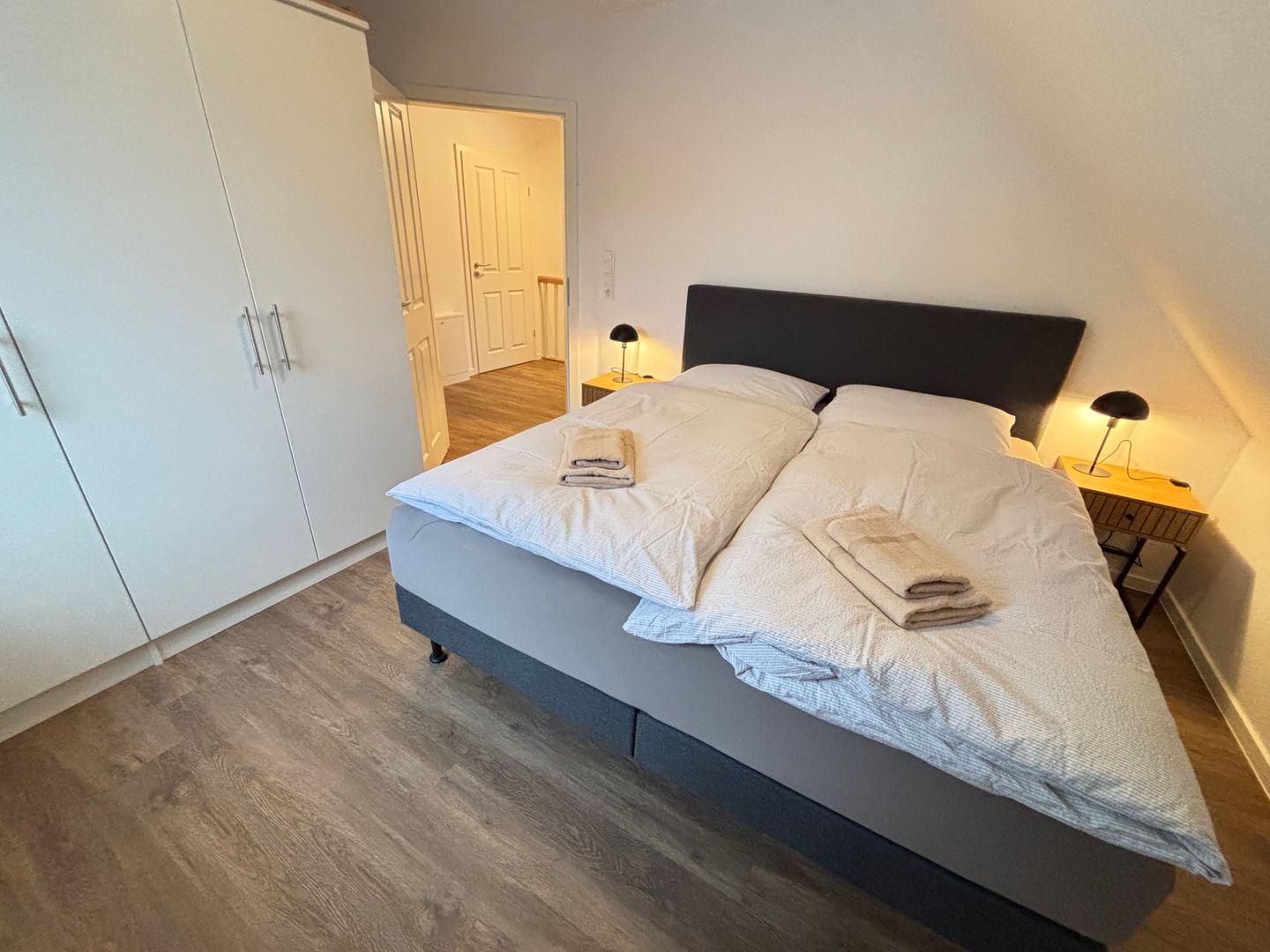 Das Ferienhaus erstreckt sich über zwei Etagen und verfügt insgesamt über fünf Zimmer, darunter drei separate Schlafzimmer mit eigenem Fernseher und Einbau-Kleiderschrank. Die großzügige, offene Küche ist zum Wohnbereich hin ausgerichtet und bietet eine komplette Ausstattung, die auch längere Aufenthalte angenehm gestaltet: Ein 4-Platten-Herd (elektrisch), Backofen, Mikrowelle, Geschirrspüler, Kühlschrank, ein separates Gefrierfach, Kaffeemaschine, Wasserkocher, Toaster, Eierkocher sowie zahlreiche Küchenutensilien stehen zur Verfügung. Ein großzügiger Esstisch mit gemütlichen Sitzmöglichkeiten schafft Raum für gemeinsame Mahlzeiten.
